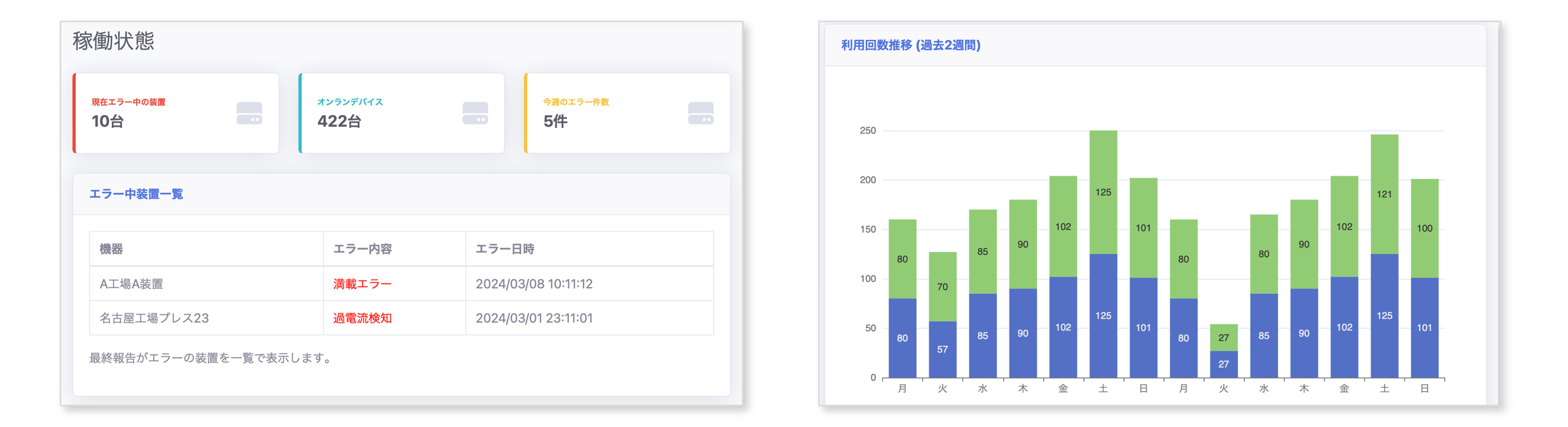 obniz Nowは、obnizのスマートデバイスを後付けするだけで始められる、機器のIoT化ソリューションです。機器の作動履歴やエラー状態などを、いつでもどこからでもWebダッシュボードで把握できるようになり、スマートな保守を実現します。