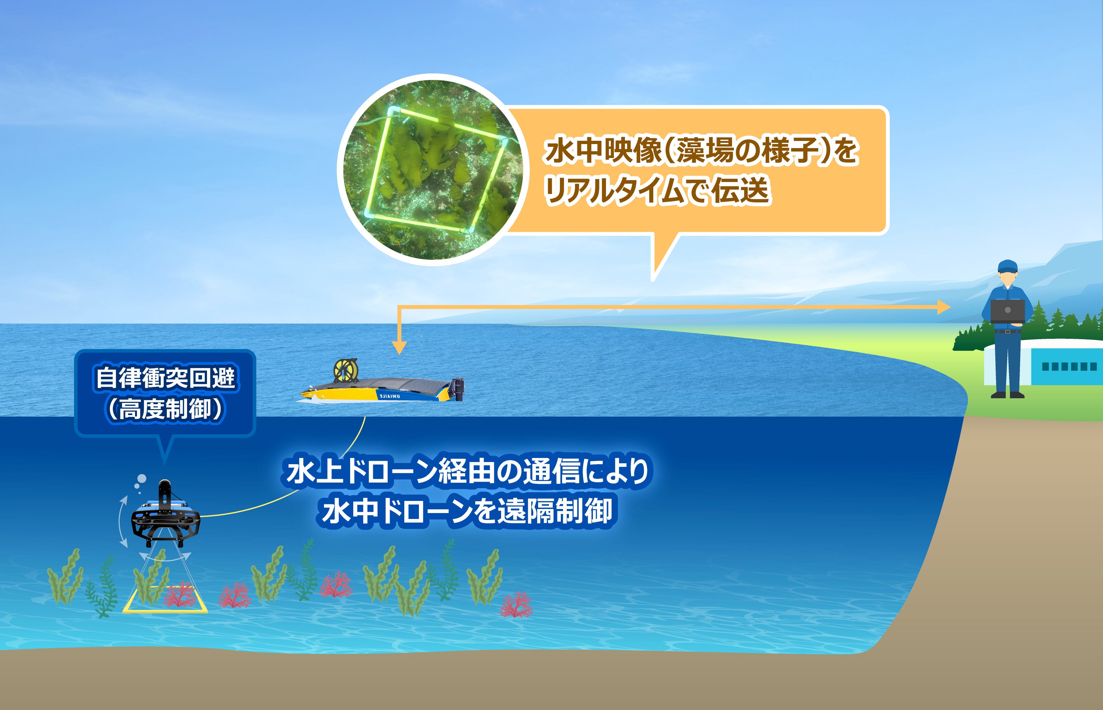 そこで本取り組みでは、UMIAILE社が開発する水上ドローンを船に代わる中継ノードとし、水上ドローン(ASV)と水中ドローン(ROV/AUV)の連携によって藻場の撮影・観測を完結させる手法の実証を行います。