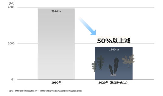 しかし、地球温暖化による海水温の上昇等の影響を受け、神奈川県内の藻場は1990年から2022年の間に約53.7%減少するなど、深刻な危機に直面しています。(神奈川県水産技術センター調査)