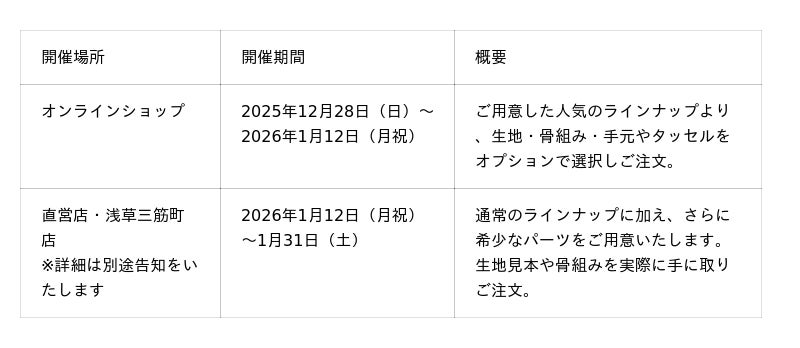 2025年12月28日(日)~2026年1月12日(月祝)まで。あなただけの特別な一本を仕立てます。