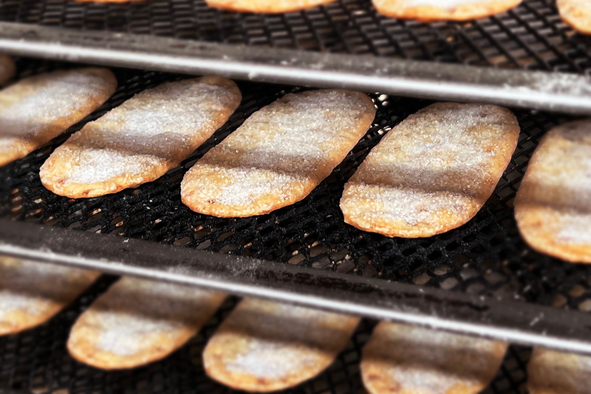 特性の異なるパイ生地とクッキー生地を重ねて一緒に延ばす工程は困難を極めましたが、幾度となく試行錯誤を重ね、機械による量産化が実現。