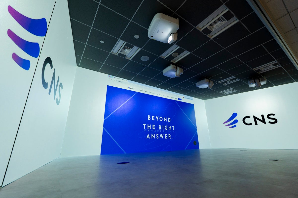 人の体験をアップデートし、“WOW”を増やすことを掲げる株式会社イマーシブ(以下、イマーシブ)は、ITインフラからクラウド、セキュリティまで企業の情報システムをトータルで支援する総合ITソリューション企業・株式会社シイエヌエス(本社:東京都品川区上大崎、以下、シイエヌエス)の新オフィスに、天地まで投影された映像空間に囲まれる没入型会議空間を実現する「Immersive Engine」と、プロジェクター映像を高コントラストに表現する塗料「Immersive Magic Wall」を導入いただきました。