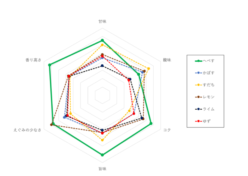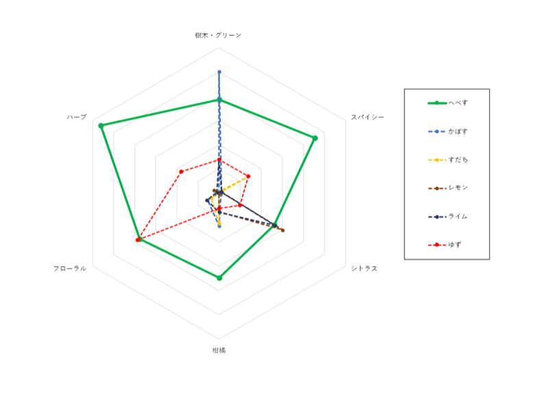 へべすは、かぼす・すだち・ゆず・レモンなどと比較して 科学的に突出した特性 を持つ香酸柑橘です。