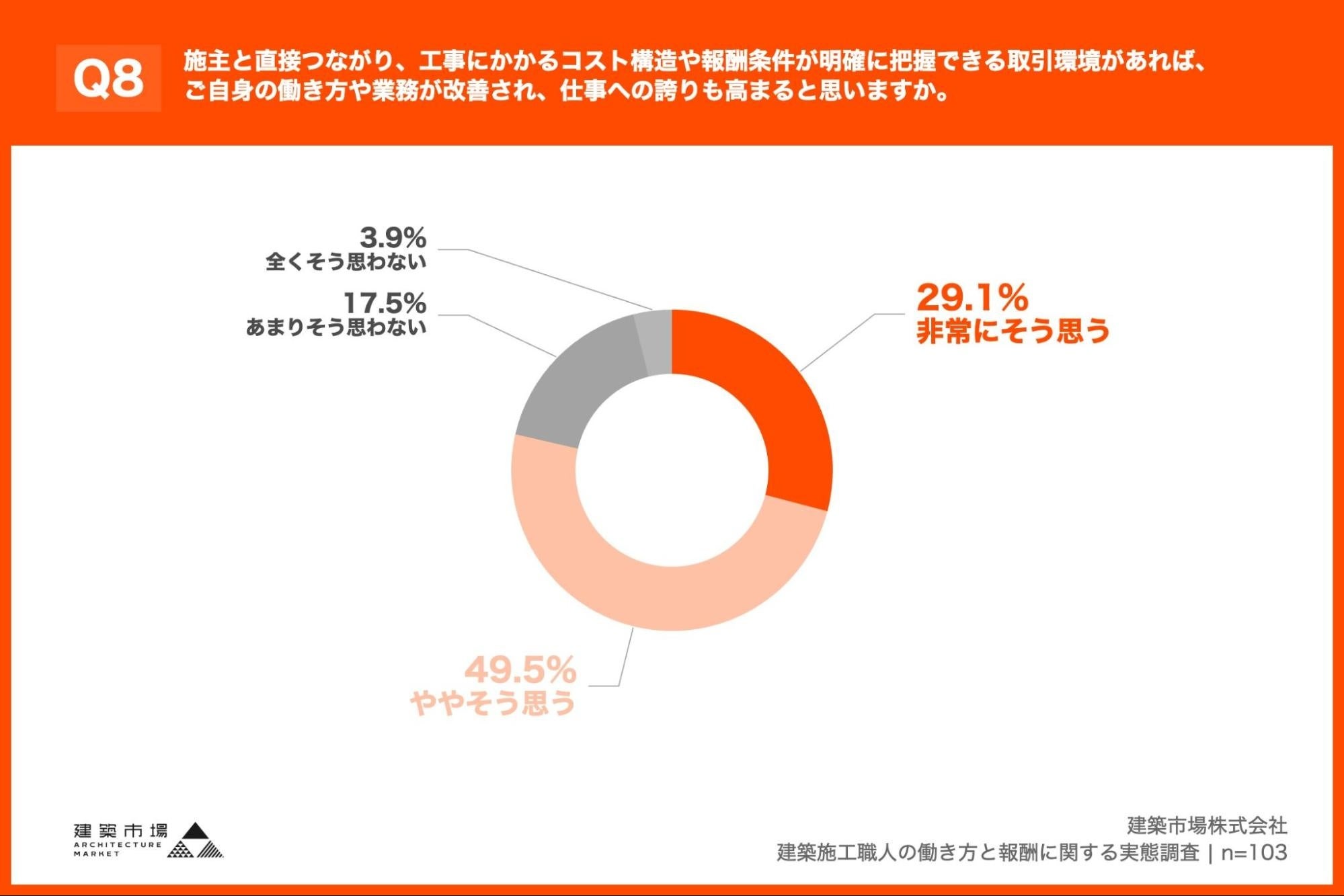 「Q8. 施主と直接つながり、工事にかかるコスト構造(材料費、ご自身の施工費、中間コストなど)や報酬条件が明確に把握できる取引環境があれば、ご自身の働き方や業務が改善され、仕事への誇りも高まると思いますか。」(n=103)と質問したところ、「非常にそう思う」が29.1%、「ややそう思う」が49.5%という回答となりました。