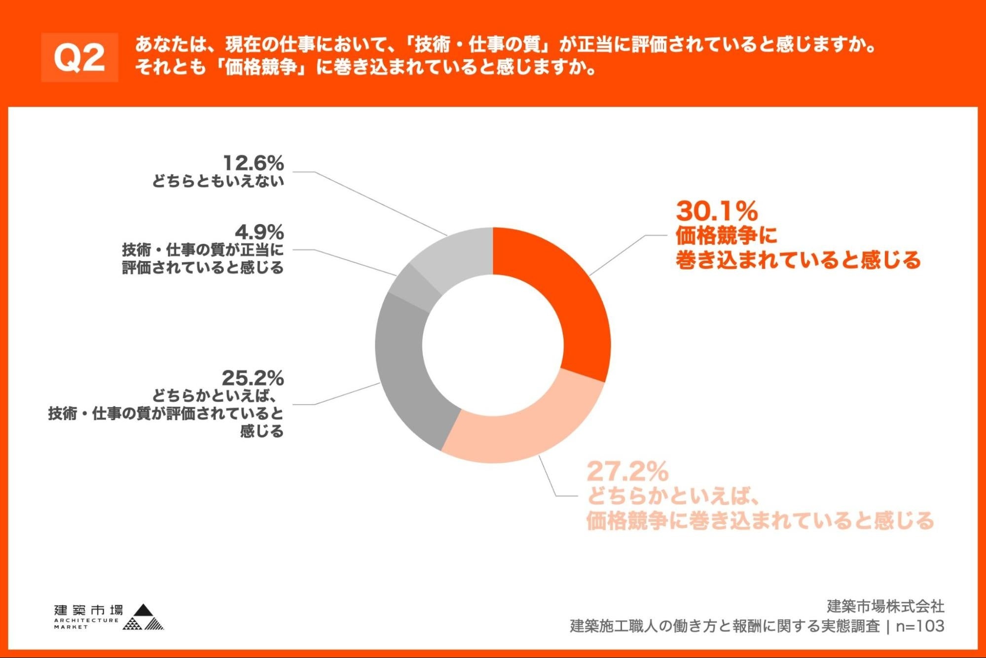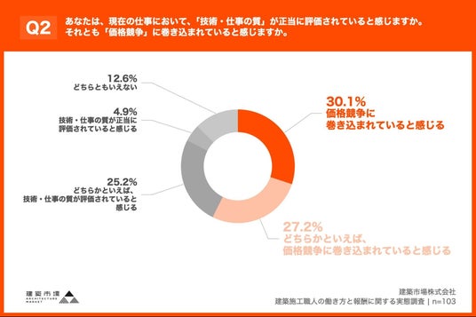 「Q2. あなたは、現在の仕事において、「技術・仕事の質」が正当に評価されていると感じますか。それとも「価格競争(安さ)」に巻き込まれていると感じますか。」(n=103)と質問したところ、「価格競争に巻き込まれていると感じる」が30.1%、「どちらかといえば、価格競争に巻き込まれていると感じる」が27.2%という回答となりました。