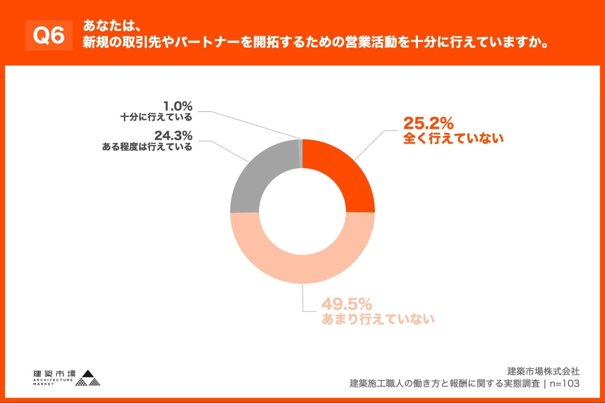 「Q6. あなた(もしくはお勤め先)は、新規の取引先やパートナーを開拓するための営業活動を十分に行えていますか。」(n=103)と質問したところ、「全く行えていない」が25.2%、「あまり行えていない」が49.5%という回答となりました。