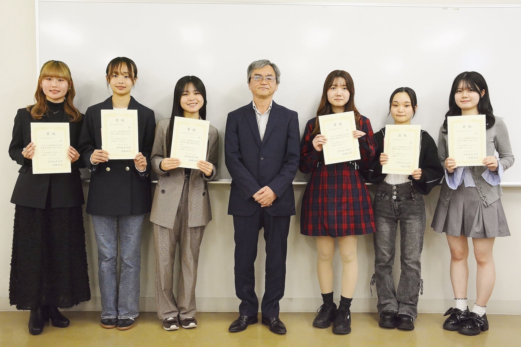 被服学科ではTES試験に合格した学生に学科オリジナルの賞状を授与しました(写真中央は榎本学科長)