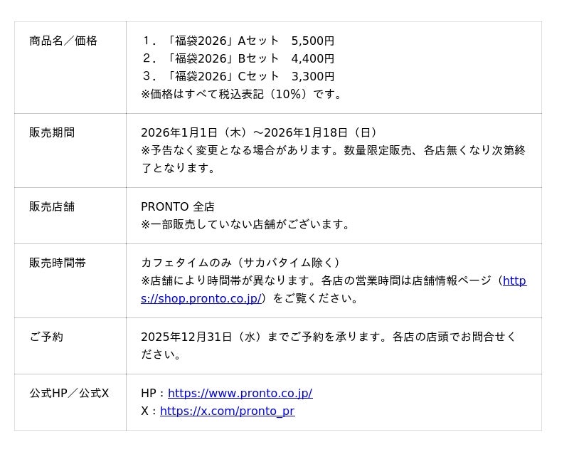 株式会社プロントコーポレーション(本社:東京都港区、代表取締役社長:杉山和弘)は、飲食チェーン『PRONTO(プロント)』にて、「福袋2026」を2026年1月1日(木)より発売します。