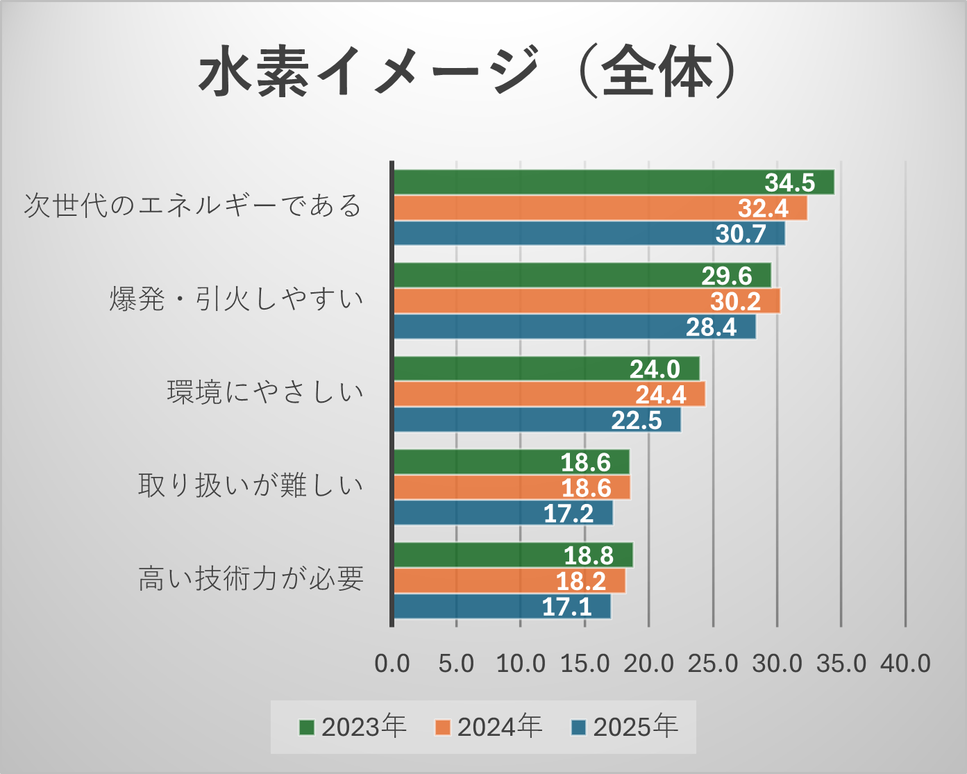 1位「次世代のエネルギーである」(30.7%)、2位「爆発・引火しやすい」(28.4%)、3位「環境にやさしい」(22.5%)と3年連続上位は同じ結果となった。