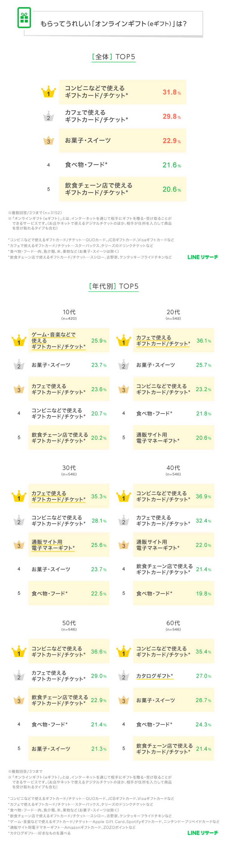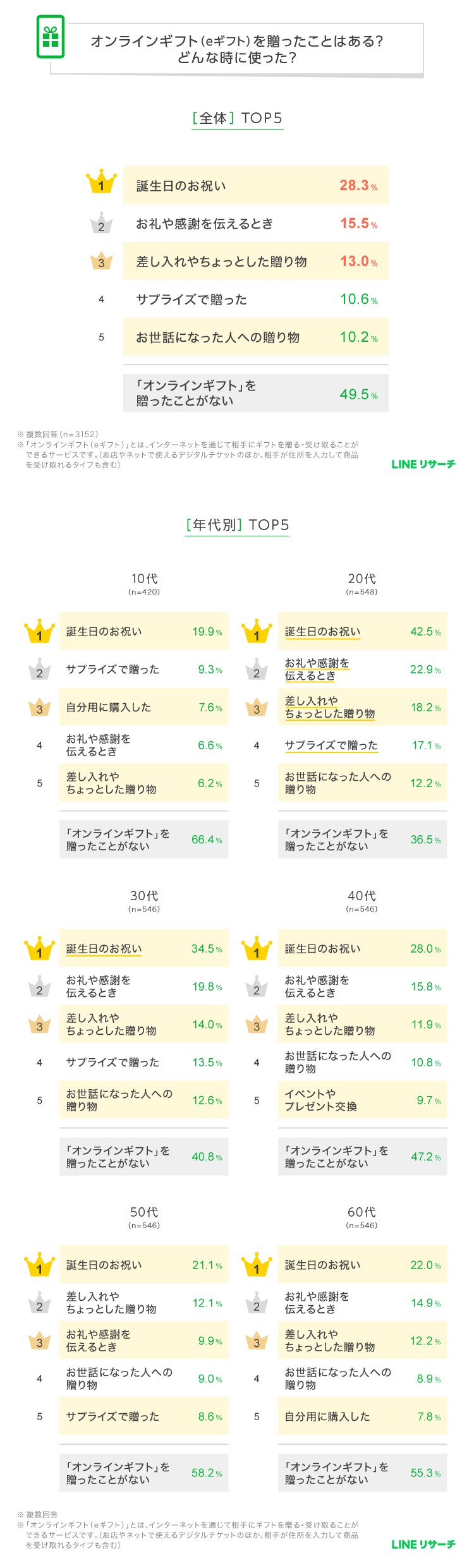 【LINEリサーチ】半数の人がオンラインギフト(eギフト)を贈った経験あり!もらってうれしいのは?10代では"体験型ギフト"が人気