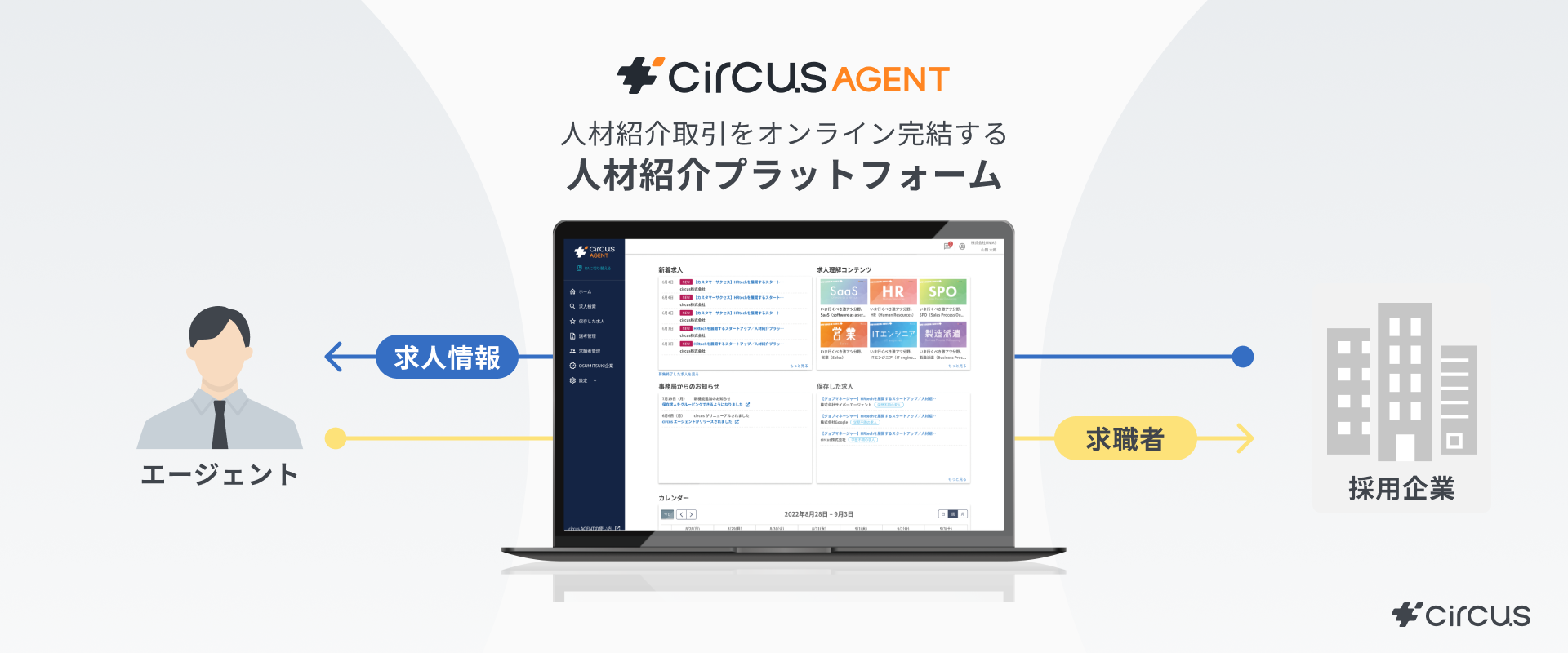 採用企業とエージェントを繋ぐプラットフォーム「circusAGENT」をはじめ、企業人事向け業務支援SaaS「circusHR β」、求職者とキャリアアドバイザーをマッチングする「転職AGENT Navi」など、HR領域における構造的な課題に応えるプロダクトを展開。採用・転職・経営判断などの、あらゆる意思決定を支えるビジネスインフラの構築に取り組んでいます。