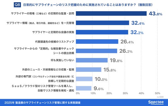 レジリエンス領域でDXを推進する株式会社Spectee(本社:東京都千代田区、代表取締役:村上 建治郎、以下 Spectee)は、製造業にお勤めの経営層とサプライチェーンに携わる業務担当者(合計500名)を対象に、「サプライチェーンリスク管理に関する実態調査」を実施しました。