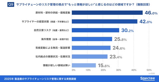 最後に、「サプライチェーンのリスク管理の視点で“もっと情報がほしい”と感じるのはどの領域ですか?(複数回答可)」と伺ったところ、『原材料・部材の供給・価格変動(46.0%)』が最も高く、次いで『サプライヤーの経営状態(倒産・不祥事など)(42.0%)』となりました。倒産については重要視するリスクとして昨年対比で伸びており、情報へのニーズも高まっているようです。