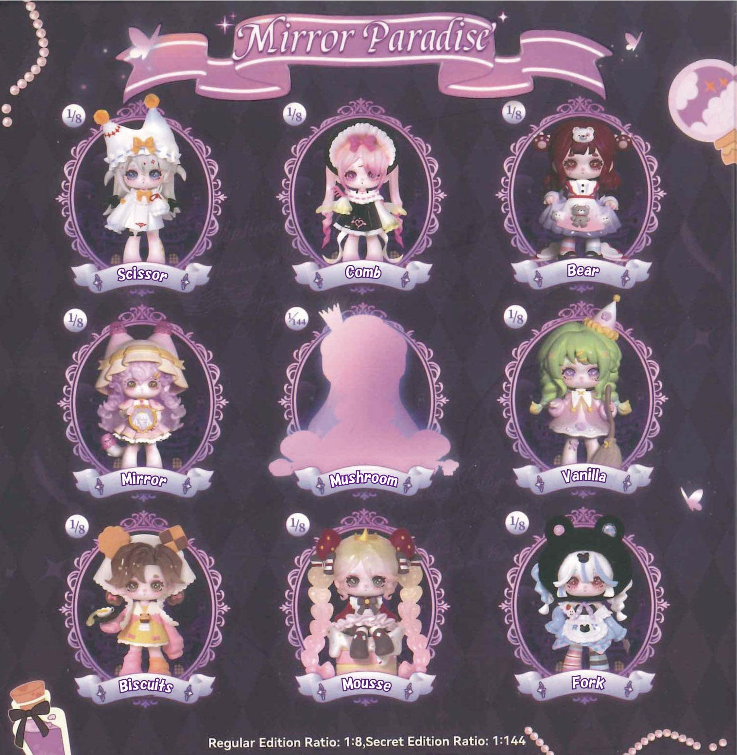 『Ninita 魔鏡楽園(ミラーパラダイス)』は、キュートでポップな可愛い魔女たちのファッションドールと開封するまでどのキャラクターが入っているか分からないワクワクを楽しめる商品として、海外で入手困難が続くほど高い人気を博しています。鏡の向こうには、壮麗な魔女の楽園が広がり、そのまばゆいばかりの美しさが解き明かされるのを待っています。『Ninita 魔鏡楽園(ミラーパラダイス)』のラインナップをぜひお楽しみください。ラインナップは通常の8種にシークレットを加えた全9種です。