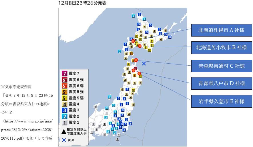 青森県東方沖を震源とする最大震度6強の地震(12月8日23:15頃)について、『ProP biz(プロップビズ)緊急地震速報配信サービス』の配信状況をお知らせいたします。