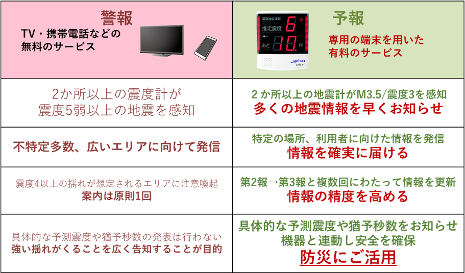緊急地震速報には、『警報』と『予報』の2つがあります。『警報』は、皆様もよく目にするテレビ、携帯電話などで、不特定多数の人向けに無料で配信される地震情報です。『予報』は、専用の端末を用いた有料のサービスで、揺れが来る前に推定震度と、実際に揺れが到達するまでの猶予秒数をお知らせします。