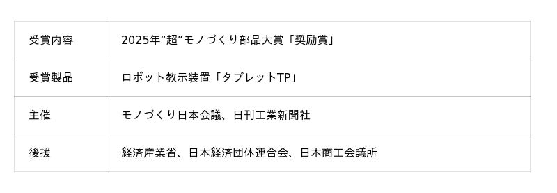 2025年12月11日、経団連会館カンファレンス国際会議場にて開催されました“超”モノづくり部品大賞贈賞式で当社のロボット教示装置「タブレットTP」が表彰されました。
