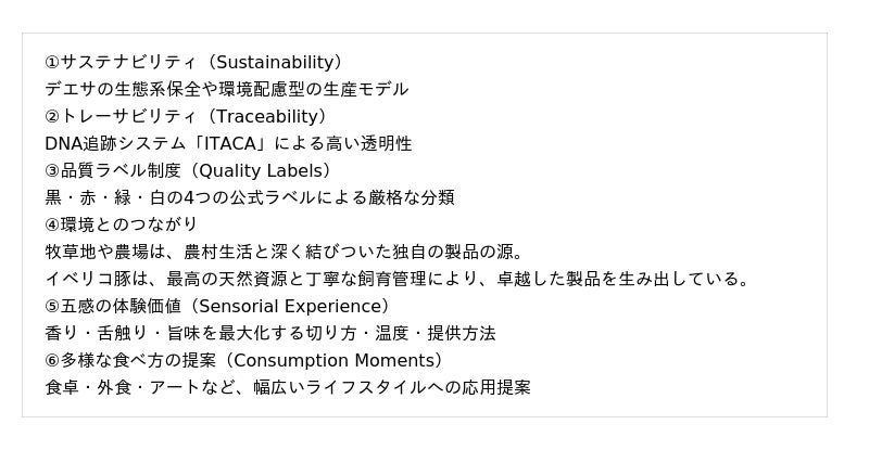 ASICIはイベリコハムが持つ文化的、食文化的価値を、以下の6つのテーマを世界基準として発信を