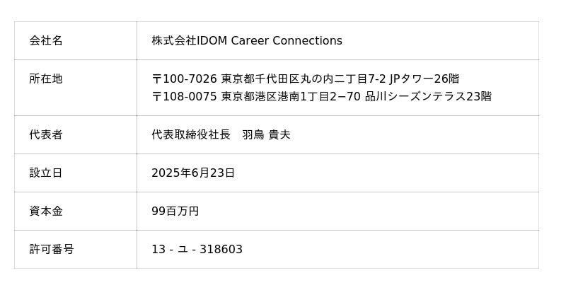 株式会社IDOM Career Connectionsは、2025年6月23日(月)に設立され、同年10月1日(水)に東京労働局の認可を受け、人材紹介事業を開始いたしました。