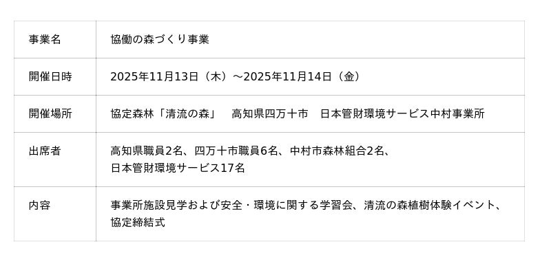 オフィスビルや商業施設等の建物管理運営事業や住宅管理運営事業、不動産ファンドマネジメント事業等を手掛ける日本管財ホールディングス株式会社(本社:東京都中央区、代表取締役社長:福田 慎太郎、以下「当社」)は、グループ会社の株式会社日本管財環境サービス(本社:大阪府大阪市、代表取締役:徳山 良一)が 、高知県「協働の森づくり事業」に関する交流会に参加したことをお知らせします。