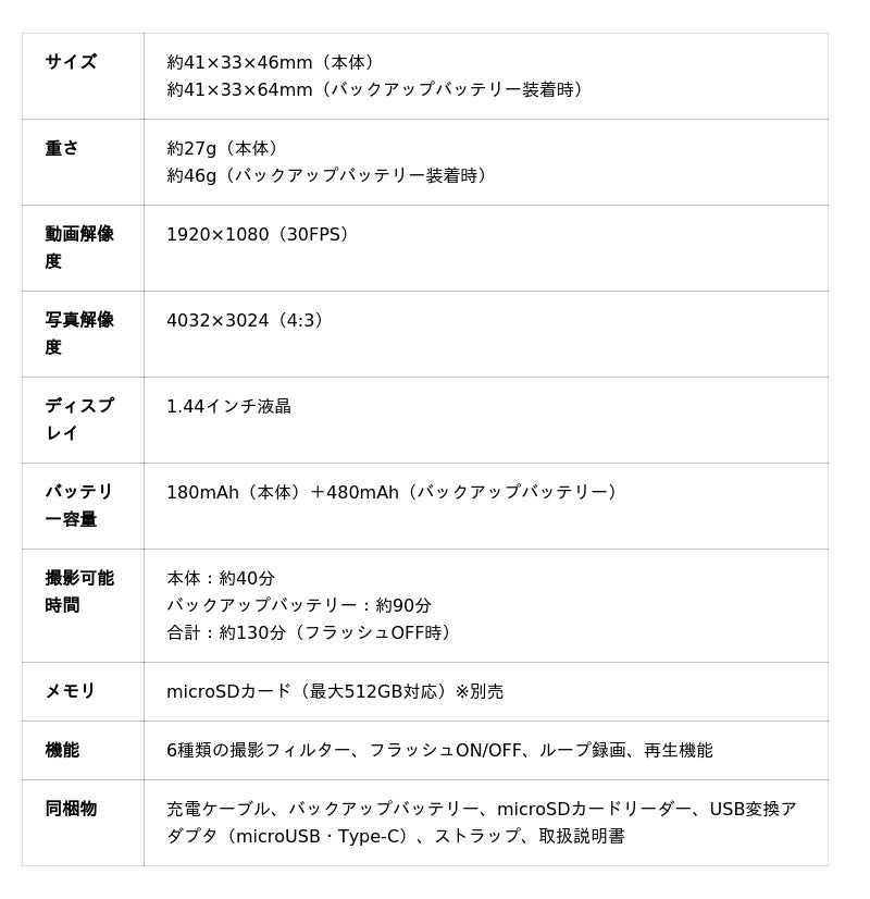 これだけの時間があれば、一日中遊んで回る時の記録も十分に賄えます。充電は付属のケーブルで簡単にできるので、気にせず使えます。