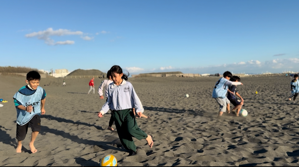 後半は、学びから一転、伸びやかに体を動かす時間へ。裸足で砂浜を走り、笑顔でボールを追いかける子どもたち。