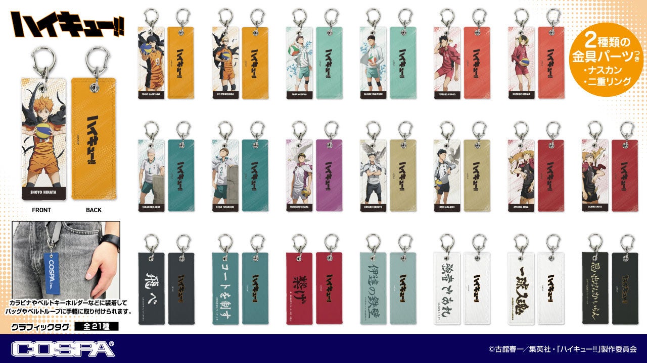 「ハイキュー!!」新グッズがCOSPAより登場。各メンバーや横断幕をデザインした新アイテムのグラフィックタグをはじめ、缶バッジ、ステッカー、バッグ、マグネット、マグカップ、パスケースがラインアップ。2025年12月20日(土)・21日(日)に幕張メッセで開催の〈ジャンプフェスタ2026〉のコスパブースでは先行販売も決定しました。