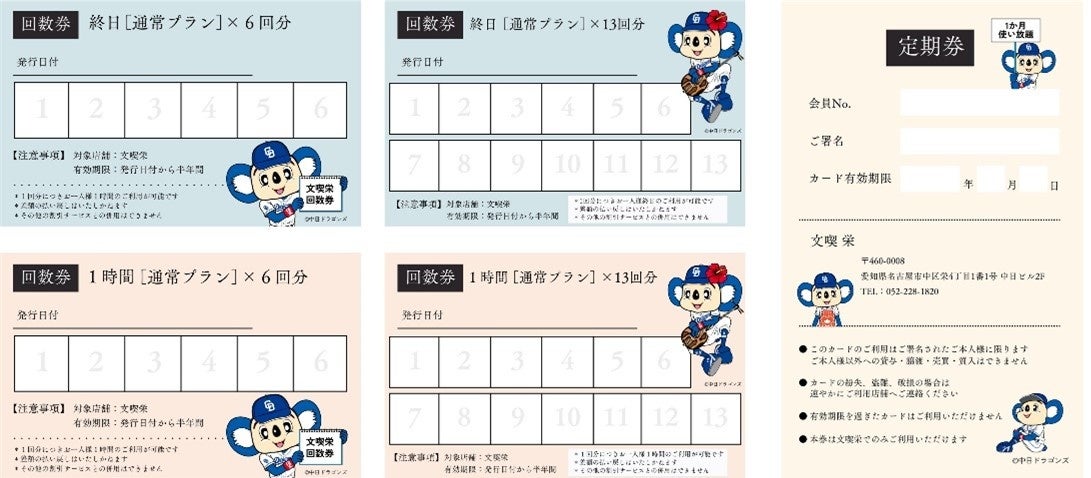 期間中は、中日ドラゴンズのマスコットキャラクター“ドアラ”をあしらった「文喫 栄」限定デザインの入場回数券・定期券や、「月刊ドラゴンズ」限定特典付き入場プランを販売します。併せて、ドアラデザインのトレーディングカード、ブックカバー・しおりなどのノベルティ配布も実施します。