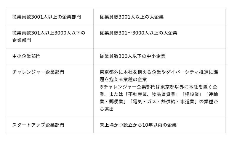 選出する企業は以下の5つの部門から、最大3社ずつです。
