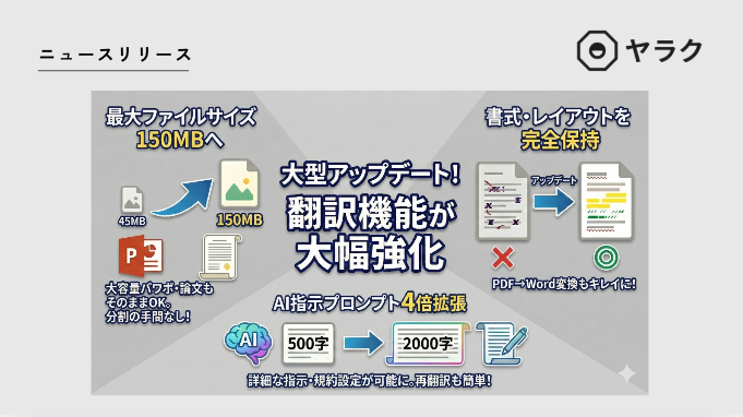 生成AI搭載の「ヤラク翻訳」、アップロード可能なファイル容量を従来の“3.3倍”の150MBに拡大|Wordの書式崩れ(太字・ハイパーリンク等)を解消