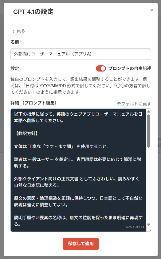 生成AI翻訳におけるカスタムプロンプトの文字数上限が大幅に拡大され、より詳細な方針・文体ガイドライン・規約等を指示として設定できるようになりました。