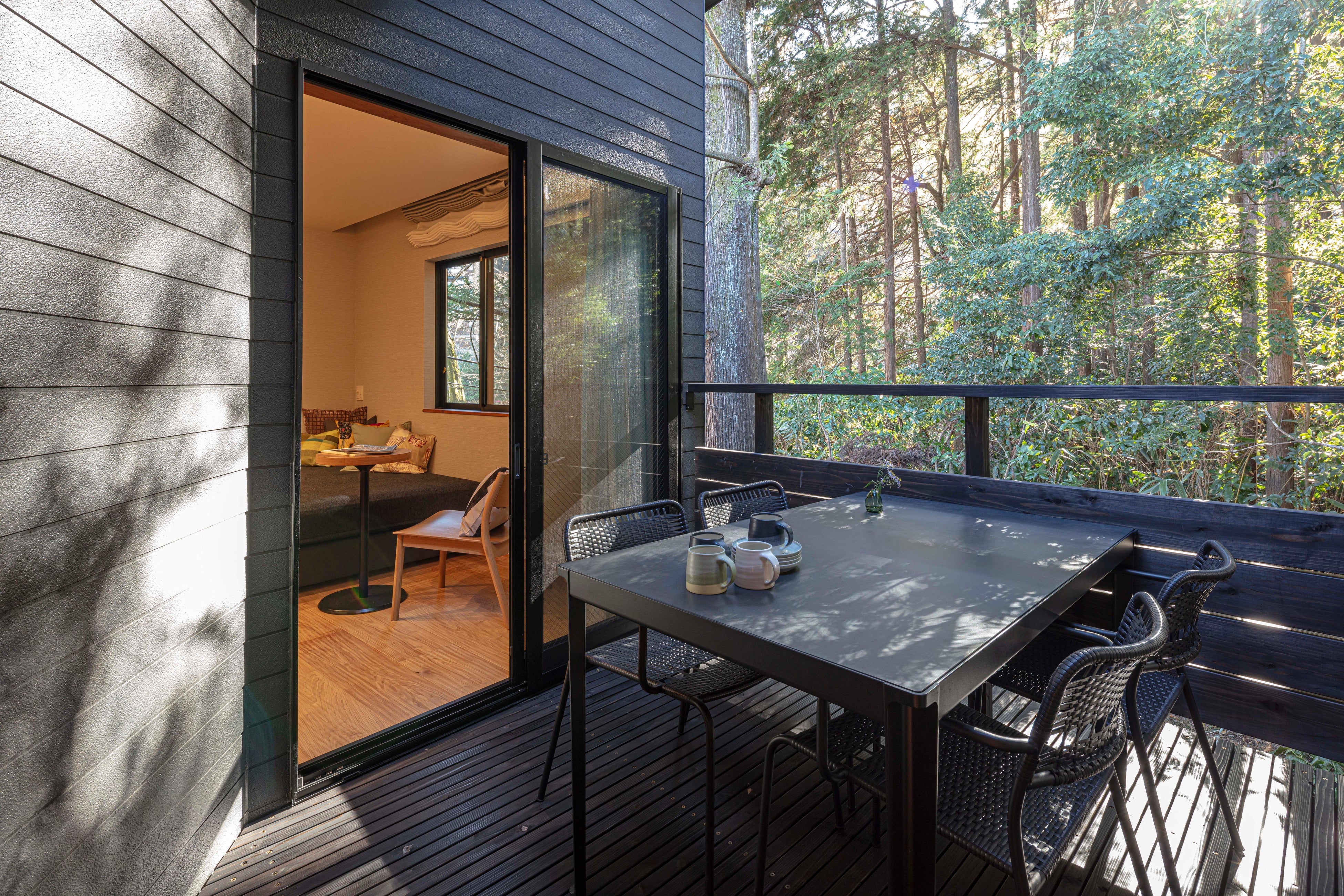 箱根の自然を間近に感じるアウトドアリビングでは、朝の光のなかでの朝食から、夕暮れ時の一杯、気分を変えたワーケーションまで、滞在のスタイルに合わせて多彩な時間をお過ごしいただけます。
