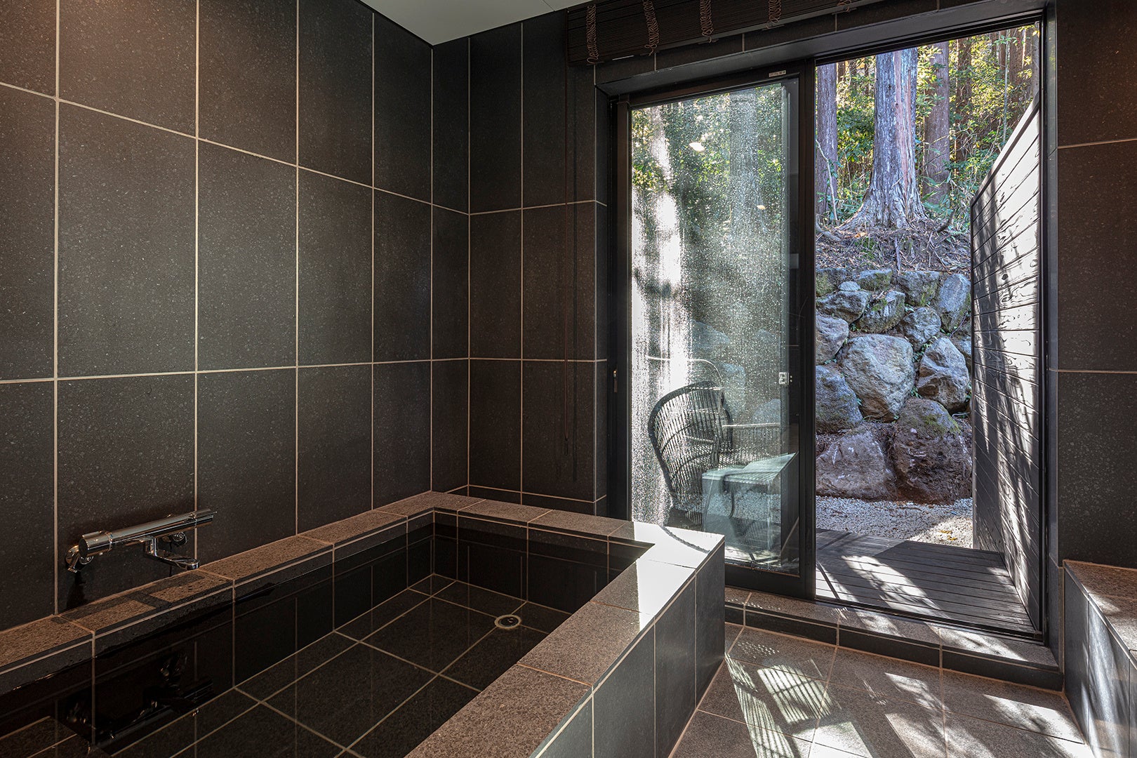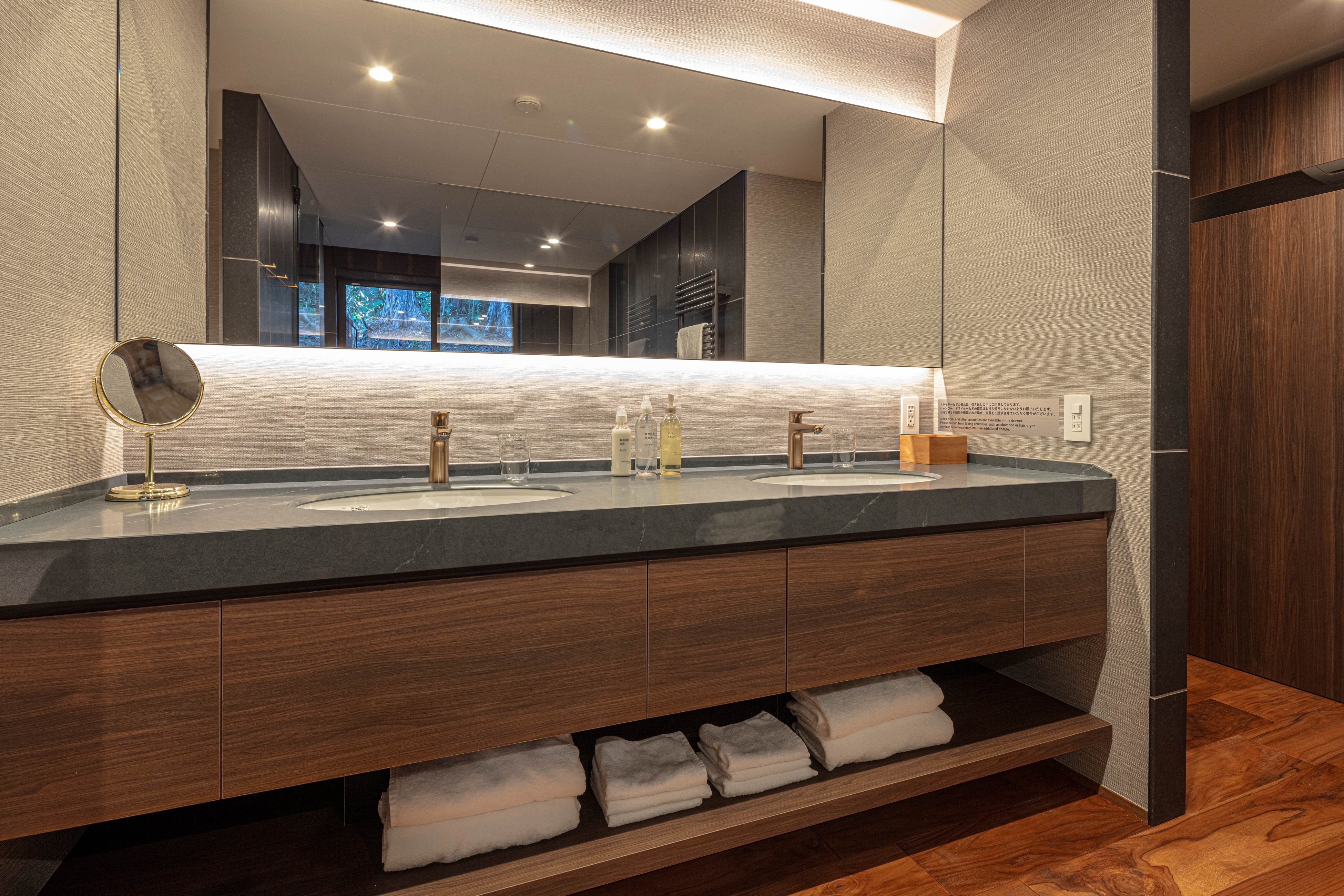 各客室のテラスでは、読書やコーヒータイムを楽しみながら、箱根の森の静けさに身を委ねる贅沢な時間を。広々としたバスルームと洗面室は当施設の自慢で、旅の疲れを癒すプライベートスパのような湯浴み体験をお届けします。