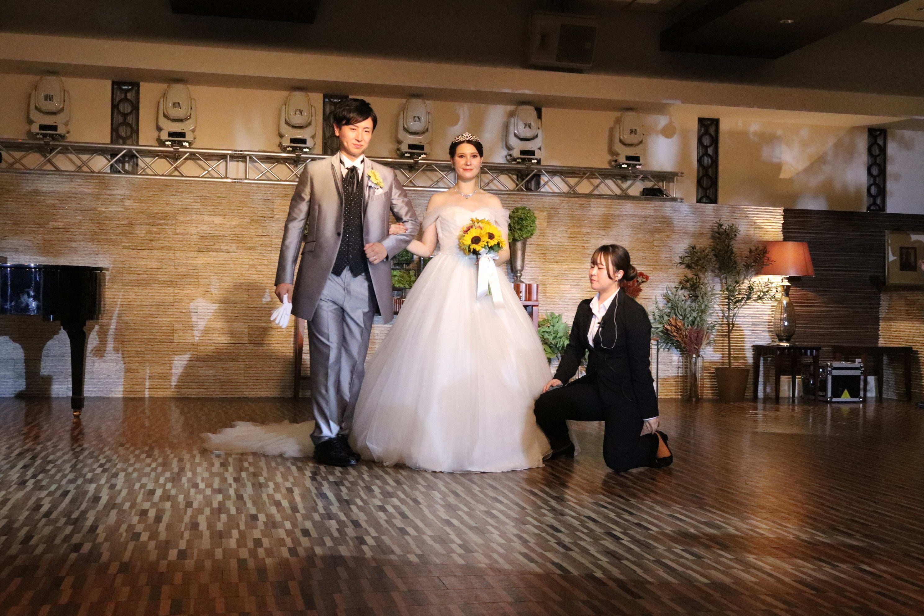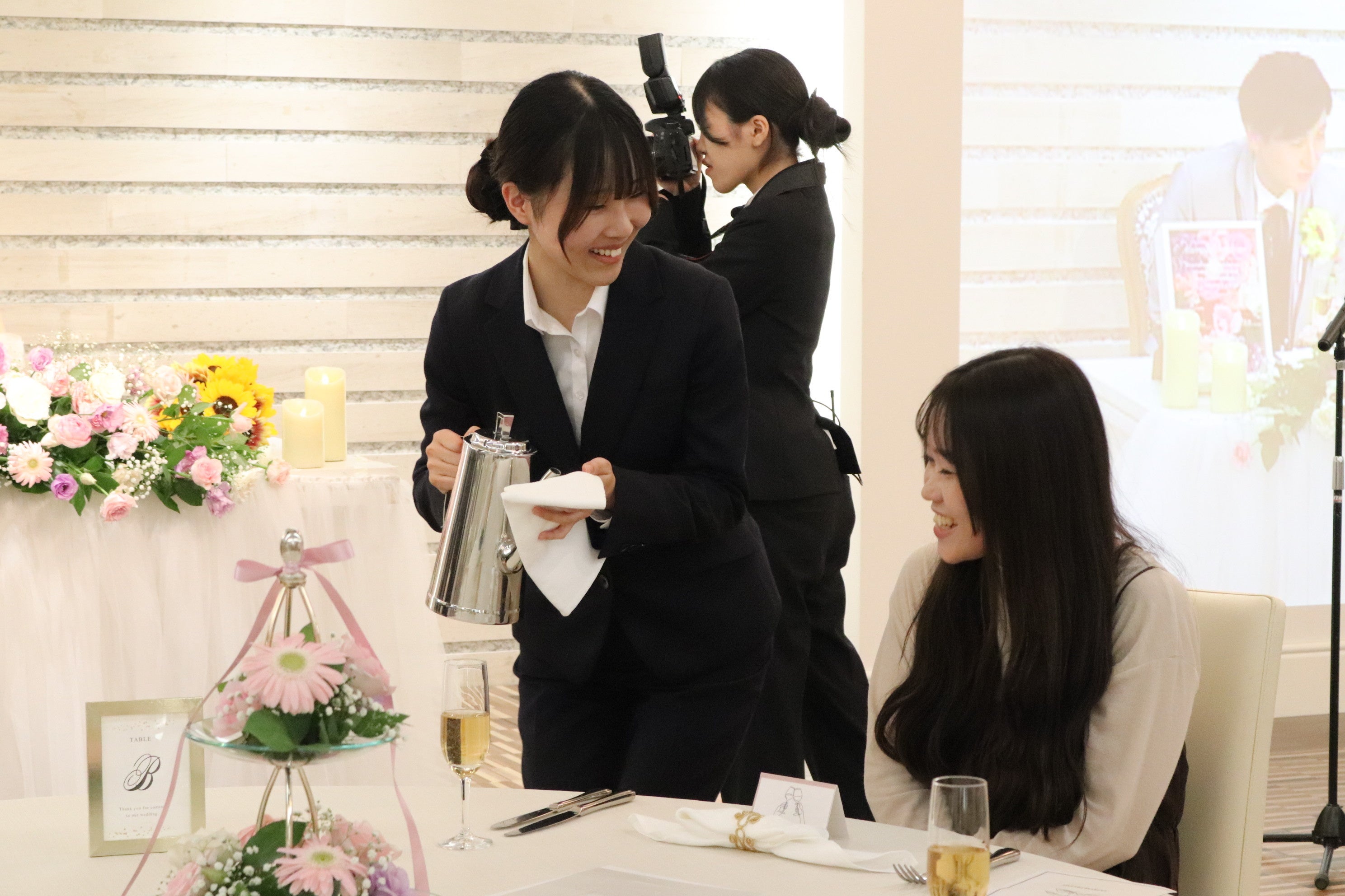 また、学生たちの担当業務は、キャプテン、アテンダー、司会、音響・照明、ドレス・ヘアメイク、フラワー装飾、カメラ・ビデオ撮影など多岐にわたり、それぞれが専門性を生かしながら連携し一つのブライダルを創り上げました。結婚式場に所属する現役プランナーから直接指導を受ける機会も設けられ、多くの関係者の協力のもと、実際の挙式・披露宴に近い形で運営を行うことができました。