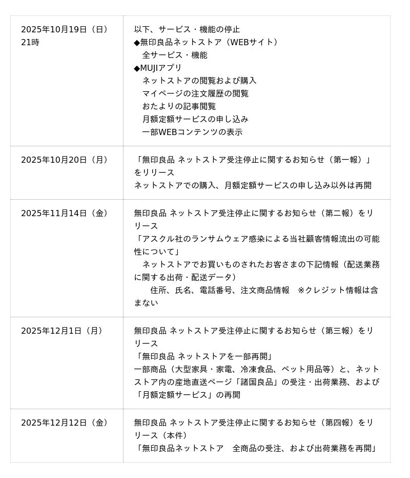 ネットストアは、主にアスクル株式会社(以下、アスクル)のグループ会社であるASKUL LOGIST株式会社が提供する3PL(サードパーティ・ロジスティクス)サービスを利用し運営していましたが、アスクルのランサムウェア感染により受注を停止していました。12月1日(月)に大型家具等一部商品の受注・出荷業務を再開しましたが、このたびネットストア全商品の受注、および出荷業務を再開いたします。