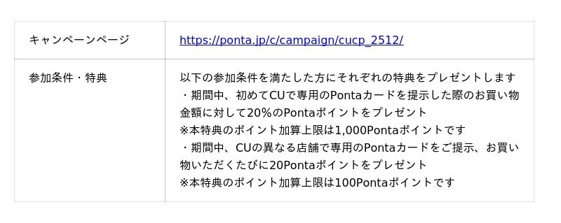 サービス開始を記念したキャンペーンとして、2025年12月12日(金)~2026年2月5日(木)の期間中、初めてCUで専用Pontaカードを提示しお買い物いただいた際、お買い物金額に対して20%のPontaポイントを還元します。また、CUの異なる店舗で専用Pontaカードをご提示、お買い物いただくたびに20Pontaポイントをプレゼントします。さらに、CUで対象商品を50%オフで購入できるクーポンを配信する他、ZIPAIRポイントがもらえるキャンペーンを同時開催します。