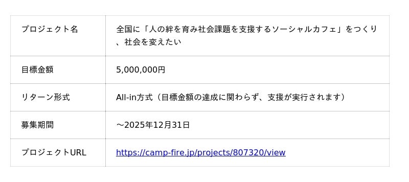 「人の絆を育み社会課題を支援するソーシャルカフェ」をつくり、社会を変えたい孤独や社会の分断といった社会課題の解決を目指し、地域課題解決型の「Social Cafe & Bar OnOkuri」の全国展開に向けた資金を募るため、2025年11月20日よりクラウドファンディングを開始いたしました。クラウドファンディングプラットフォーム「CAMPFIRE」にて、年内2025年12月31日まで支援を募集しています。短期間のチャレンジとなりますが、私たちの取り組みを多くの方に知っていただけると嬉しく思います。