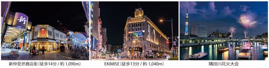 5つのエリアに分かれた浅草最大のアーケード商店街である「新仲見世商店街」を日常の一部とし、無印良品やダイソーなど人気店が集結する「浅草ROX」や、仲見世と駅が融合した複合商業施設「EKIMISE」など、生活を快適に支える商業施設も充実しています。さらに、夏の風物詩である隅田川花火大会を身近に楽しめるという、都心では希少な特別なロケーションを享受できます。