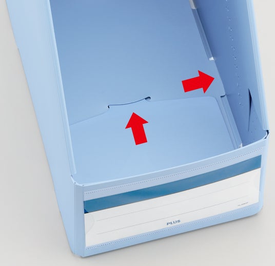 本体の底面にある2カ所のツメを差し込むだけで簡単に組み立てできます。クラス全員分のボックスファイルを組み立てる先生の負担を軽減します。