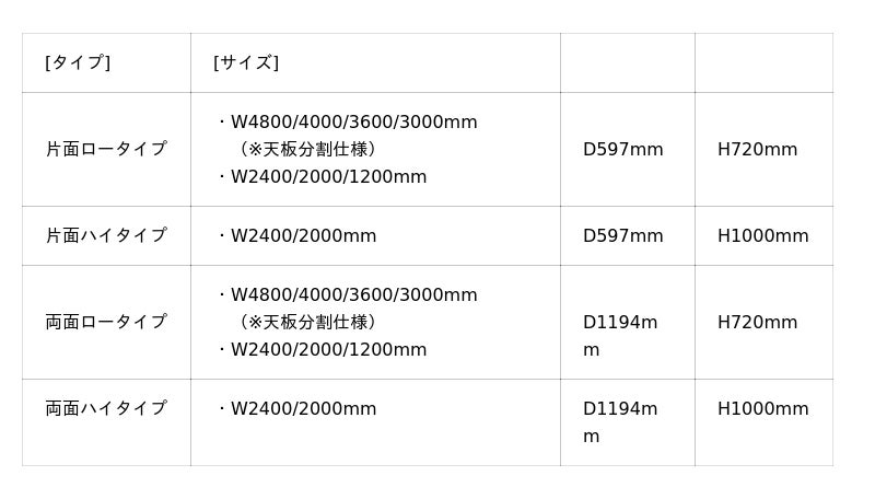 機能性を重視したムダのないシンプルなデザインは、使いやすくさまざまなインテリアに調和します。サイズのほか、片面・両面、ロータイプ・ハイタイプの幅広いラインアップから選んで組み合わせることで、デスクワークからミーティングまで柔軟なレイアウトが可能です。