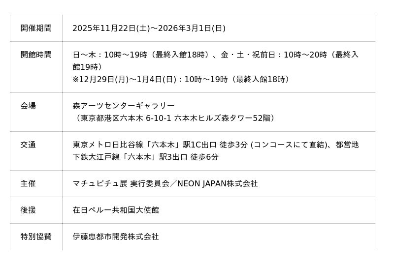 伊藤忠都市開発株式会社(本社:東京都港区、代表取締役社長:松 典男、以下「伊藤忠都市開発」)は、2025年11月22日(土)より開催している「マチュピチュ展」のタイトルスポンサーに就任致しました。