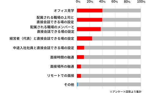 ・選考での要望は、「オフィス見学」「配属される職場の上司と直接会話できる場の設定」「配属される職場のメンバーと直接会話できる場の設定」など職場環境が分かる機会の設定が上位となった。
