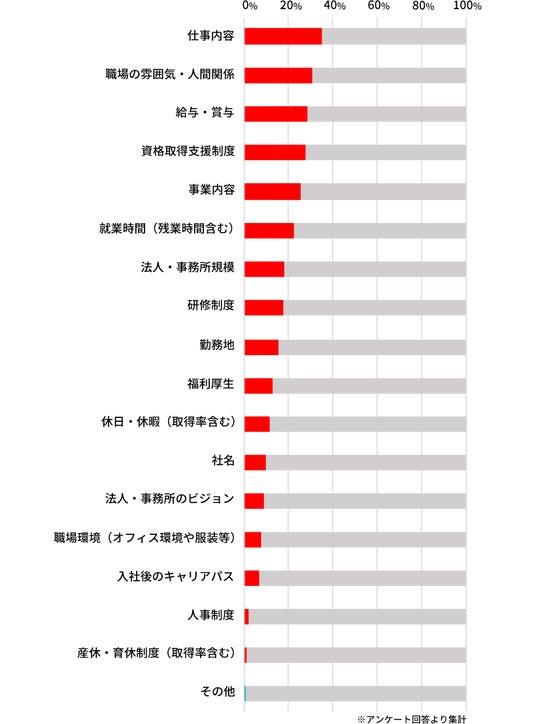 全体で最も回答が多かったのは「仕事内容」で、次いで「職場の雰囲気・人間関係」「給与・賞与」「資格取得支援制度」となった。世代別で最も多かった回答は、学生:「資格取得支援制度」、20代以下(学生除く)・30代・40代以上:「仕事内容」であった。