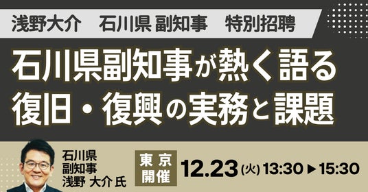 JPI(日本計画研究所)は、石川県 副知事 浅野 大介 氏を招聘し、復旧・復興の実務と課題について詳説いただくセミナーを開催します。