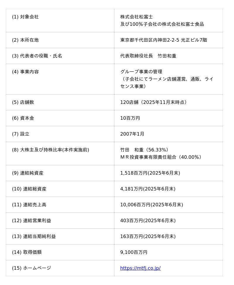 このたび、関東を中心に直営でラーメンチェーンを展開する松富士の全株式取得し子会社化するための株式譲渡契約を締結しました。松富士は、全9 ブランド・120 店舗(2025 年11 月末時点)を関東ドミナントで展開し、所沢のセントラルキッチンを核とした品質・衛生管理、多様な立地フォーマットでの高い再現性を強みとする企業です。なかでも「六厘舎」をはじめとする旗艦ブランドは、東京駅や羽田空港等の主要立地で培われた高い認知度と強固な顧客支持を有し、来店動機を喚起するブランド力が同社の成長を牽引しています。ブランド・客層ごとに最適な商品提供を可能にする商品開発力を有し、通販も伸長。海外を含め未進出エリアへの出店余地が大きいと評価しています。