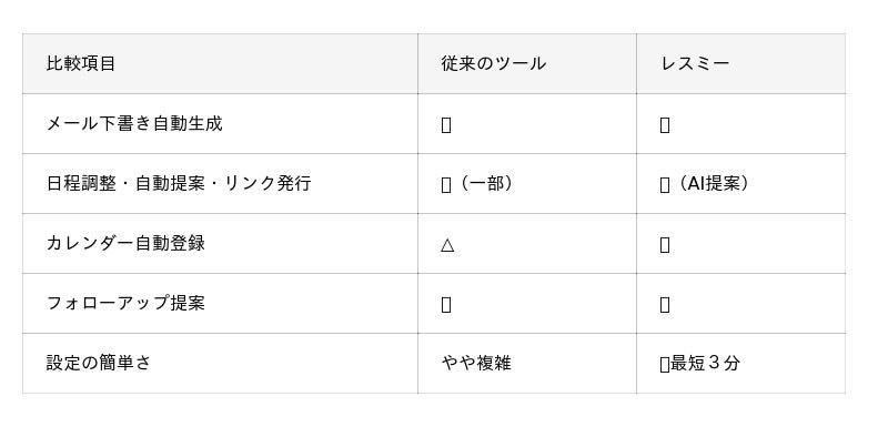 レスミーは、従来の「日程調整ツール」や「メールテンプレート支援サービス」と異なり、