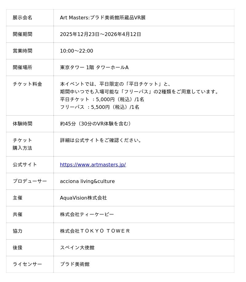 株式会社ティーケーピー(本社:東京都新宿区、代表取締役社長:河野 貴輝、以下TKP)は、2025年12月23日より、AquaVision株式会社(本社:東京都新宿区、代表取締役社長:付斯瑶(フ シヨウ))と共同で開催するプラド美術館のVRアート展「Art Masters:プラド美術館所蔵品VR展 Powered by TKP」の公式サイトを公開し、チケット販売を開始したことをお知らせいたします。