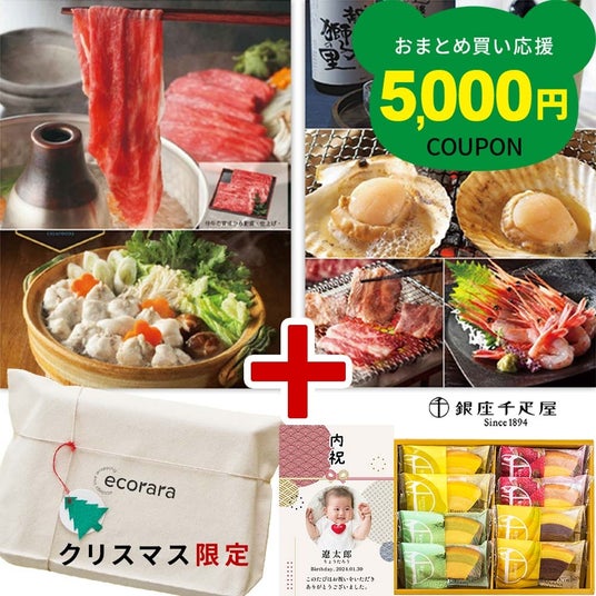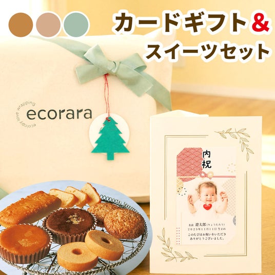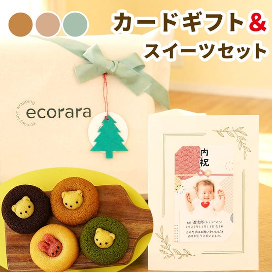「エコララ」シリーズは、「エコラララッピング」+「赤ちゃん名刺ギフト」 を共通仕様とし、その上で中身のギフトを変えたセット商品を展開しています。現在ご用意しているセットは以下の2タイプです。