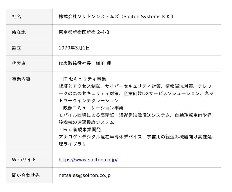 設立以来、ソリトンシステムズは IT・エレクトロニクス業界にあって、常に新しい技術トレンドを見据え、いくつもの「日本で初めて」を実現してきました。近年は、認証を中心とした IT セキュリティからサイバー対策まで、また、携帯電話回線4G、5G や Wi-Fi を利用した高精細の映像伝送システム、遠隔運転、遠隔操作などに取り組んでいます。国産メーカーとして、オリジナルの「もの創り」、「独創」にこだわった製品とサービスを提供しています。