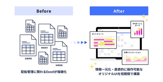 - - 営業管理・配船指示・採算管理に関わるExcelが複雑化し、情報集約に時間を要していた。リアルタイムに情報を共有できる環境が求められていた。